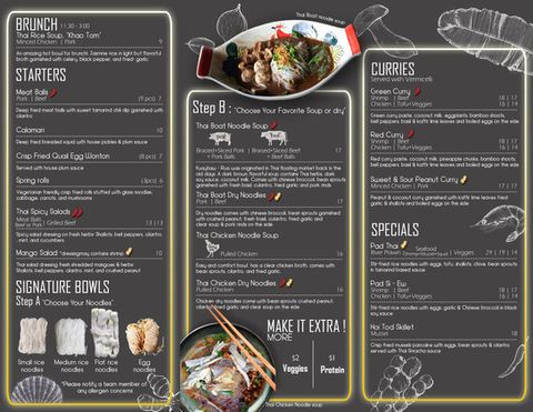 Thai: ก๋วยเตี๋ยวเรือ, pronounced [kuay teow reua] This traditional Thai noodle soup, was originated in floating markets back in the old days of central region, Thailand. It's dark brown flavorful soup contains a bunch of Thai herbs, dark soy sauce, coconut milk. Always comes pork rinds, Chinese broccoli or Morning Glory (seasonal), bean sprouts and garnished with fresh basil, culantro, fried garlic.